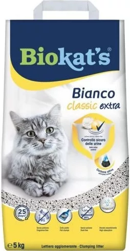 A Biokat's Bianco Classic Extra 5kg természetes, fehér csomósodó macskaalom aktív szénnel. Kiemelkedő szagmegkötés, erős nedvszívás, pormentes formula és stabil csomók biztosítják a higiénikus, gazdaságos alomtálcát.
