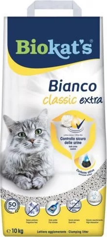 A Biokat's Bianco Classic Extra 10kg természetes, fehér csomósodó macskaalom aktív szénnel. Kiváló szagmegkötés, erős nedvszívó képesség, pormentes formula és stabil csomók biztosítják a higiénikus, gazdaságos alomtálcát.