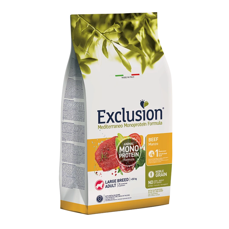 Az Exclusion Mono Noble Grain Adult Beef Large 12 kg egy teljes értékű, monoprotein száraz kutyatáp, amelyet kifejezetten 30 kg feletti, 1 évesnél idősebb nagytestű felnőtt kutyák számára fejlesztettek ki.