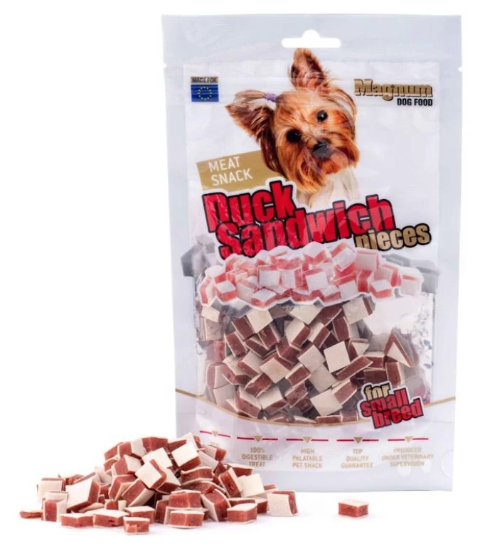 A Magnum Kacsa Szendvics egy puha, kacsahús alapú jutalomfalat kutyák számára, szabálytalan, kb. 1×1 cm-es kockák formájában. Kifejezetten kis kutyák igényeihez igazították, így könnyen fogyasztható és ideális jutalom a parancsok teljesítéséhez, tréninghez vagy játék közbeni motivációhoz.