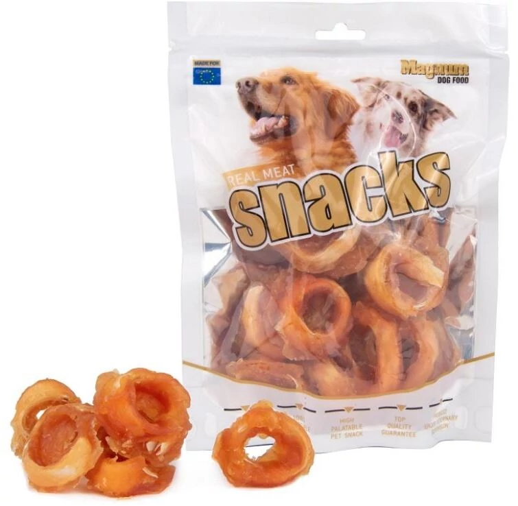 A Magnum Tintahal Karika jutalomfalat egy lágy állagú, húsalapú snack kutyák számára, amely csirke- és halhúsból készül. Közepes méretű karika formájának köszönhetően könnyen adagolható, így kiváló választás jutalmazásra, tréninghez vagy utazás közbeni kiegészítő táplálásra.