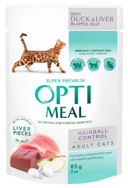 Az Optimeal Hairball kacsa és máj almával zselében teljes értékű, super premium macskaeledel, amelyet kifejezetten a szőrlabda-képződés csökkentésére fejlesztettek ki. Az étrend állatorvosi felügyelet mellett, a Swiss Pet Nutrition Group technológiájával készül.