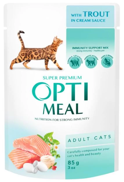 Az Optimeal Pisztráng krémes szószban 12x85g ideális választás, ha macskája számára magas fehérjetartalmú, halas alapú, szuper prémium nedves macskaeledelt keres, amely támogatja az immunrendszert, a húgyutak egészségét és a szőrzet szépségét.