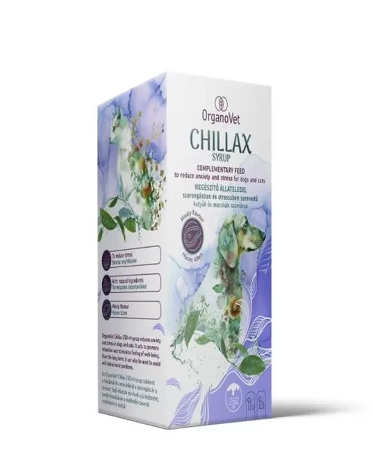 Az OrganoVet Chillax 250 ml szirup egy folyékony, szájon át adható kiegészítő takarmány kutyák és macskák számára, amely a stressz és szorongás csökkentésére szolgál. Speciális összetétele támogatja az idegrendszer működését, segíti az ellazulást és hozzájárul a kiegyensúlyozott viselkedéshez.