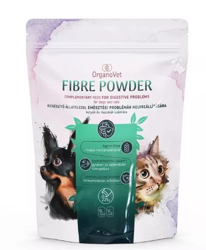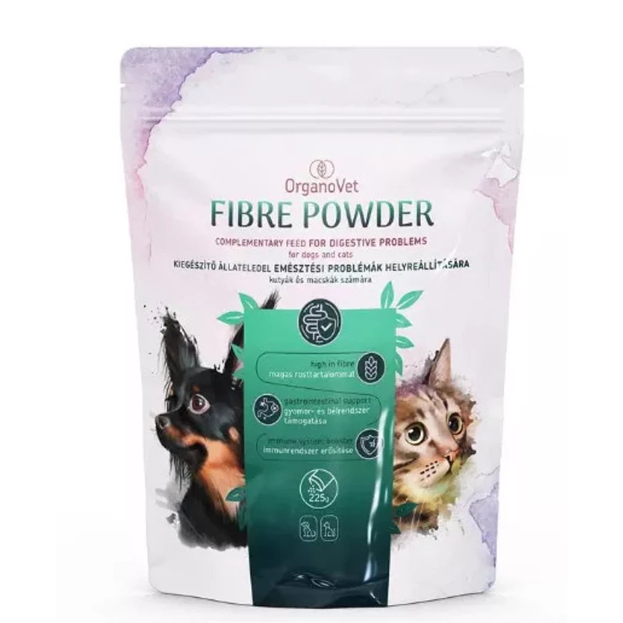 Az OrganoVet Fibre Powder 225 g egy por állagú kiegészítő takarmány kutyák és macskák számára, amely oldható és oldhatatlan rostokat, prebiotikumokat és probiotikumokat tartalmaz. Célja a bélműködés szabályozása, az egészséges bélflóra fenntartása és az emésztési problémák csökkentése.