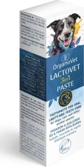 Az OrganoVet Lactovet 3 in 1 Paste egy speciális fogápoló paszta kutyák és macskák számára. Háromszoros hatásával egyszerre célozza meg a lepedéket, a fogkőképződést és a kellemetlen szájszagot. Rendszeres használat mellett támogatja a szájüreg egészségét és segít megelőzni a fogászati problémákat.