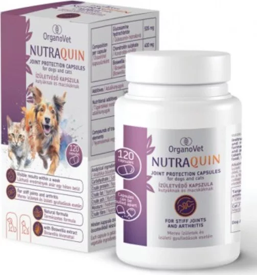 Az OrganoVet NutraQuin olyan célzott ízületvédő megoldás, amely nemcsak a tüneteket kezeli, hanem a kiváltó okokra is hat. A glükozamin és kondroitin támogatja a porcok újjáépülését, míg a Boswellia kivonat a gyulladás csökkentésében játszik szerepet. Gyorsan érzékelhető hatása és magas hatóanyag-tartalma miatt ideális választás, ha hosszú távú megoldást keresel kedvenced mozgásszervi problémáira.