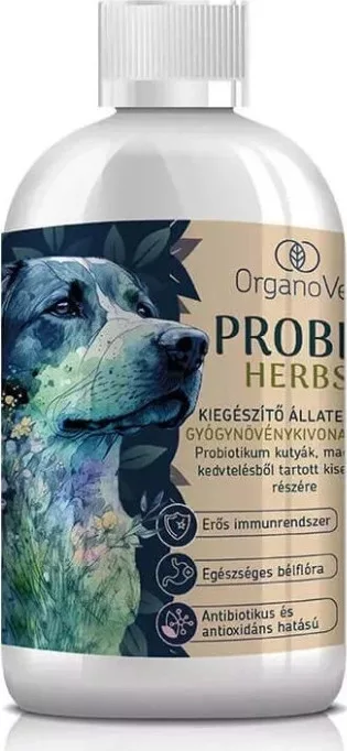 Az OrganoVet Probio Herbs egy folyékony probiotikus kiegészítő állateledel, amely élő mikroorganizmusokat és gyógynövény kivonatokat tartalmaz. Segíti a bélflóra egyensúlyának helyreállítását, támogatja az emésztést és hozzájárul a tápanyagok jobb felszívódásához. Savas kémhatása (pH 3,5) kedvező környezetet biztosít a hasznos bélbaktériumok számára.