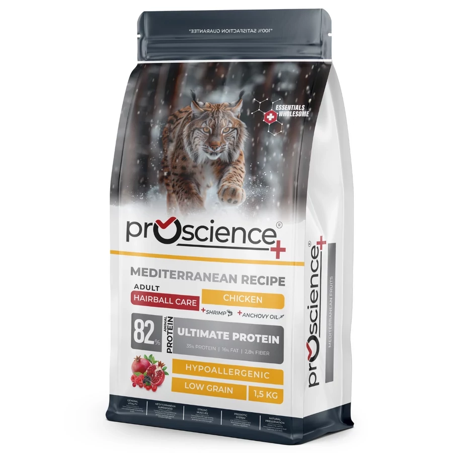 A ProScience Adult Cat Chicken Hairball ízvilága mediterrán inspirációjú, így a macskák számára kellemes és változatos étkezést biztosít. A receptúra a szőrzet fényességéért, a bélflóra egyensúlyáért és a szőrlabdák kialakulásának csökkentéséért készült.