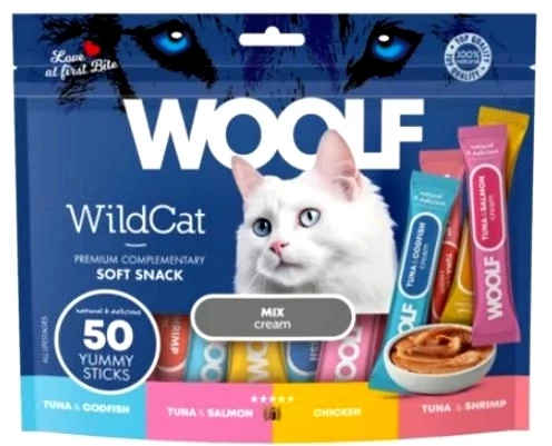 A Woolf Wildcat Creamy Snack MIX egy válogatott, folyékony állagú jutalomfalat csomag macskáknak, amely négy különböző receptúrát tartalmaz. A csomagban csirkés, valamint különböző halas kombinációk (tonhal–lazac, tonhal–tőkehal, tonhal–garnéla) találhatók. Minden variáns csirkemájjal készül az intenzív ízélmény érdekében, 100% természetes összetevőkkel, adalékanyagok nélkül.