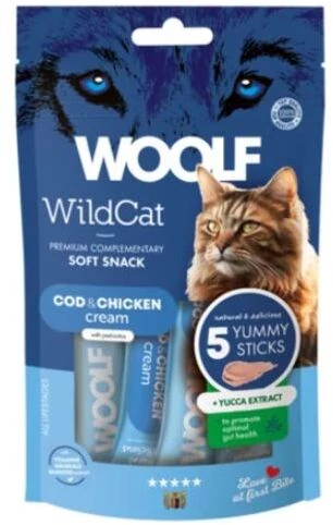 A Woolf Wildcat Creamy Snack Cod & Chicken egy folyékony állagú jutalomfalat macskáknak, amely 30% tőkehalat és 20% csirkét tartalmaz. A receptet csirkemáj, tengeri moszat kivonat, vitaminok, ásványi anyagok és prebiotikumok egészítik ki. A hozzáadott yucca kivonat az emésztés támogatására és a bélrendszer egészségének fenntartására szolgál.